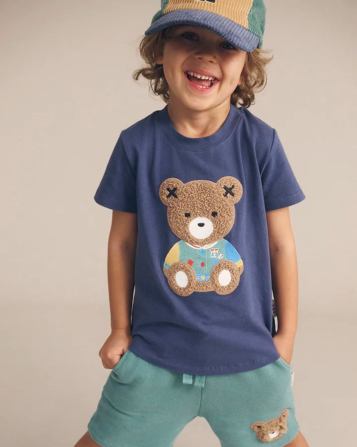 Buttery soft, premium organic cotton tee with furry college Huxbear on front
